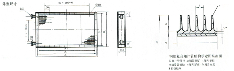 外径D(mm) | 翅片高度h(mm) | 翅片厚度s(mm) | 翅片节距t(mm) | 铝管壁厚h(mm) | 钢管壁厚h(mm) | 总外表面积Sw(m²/m) |